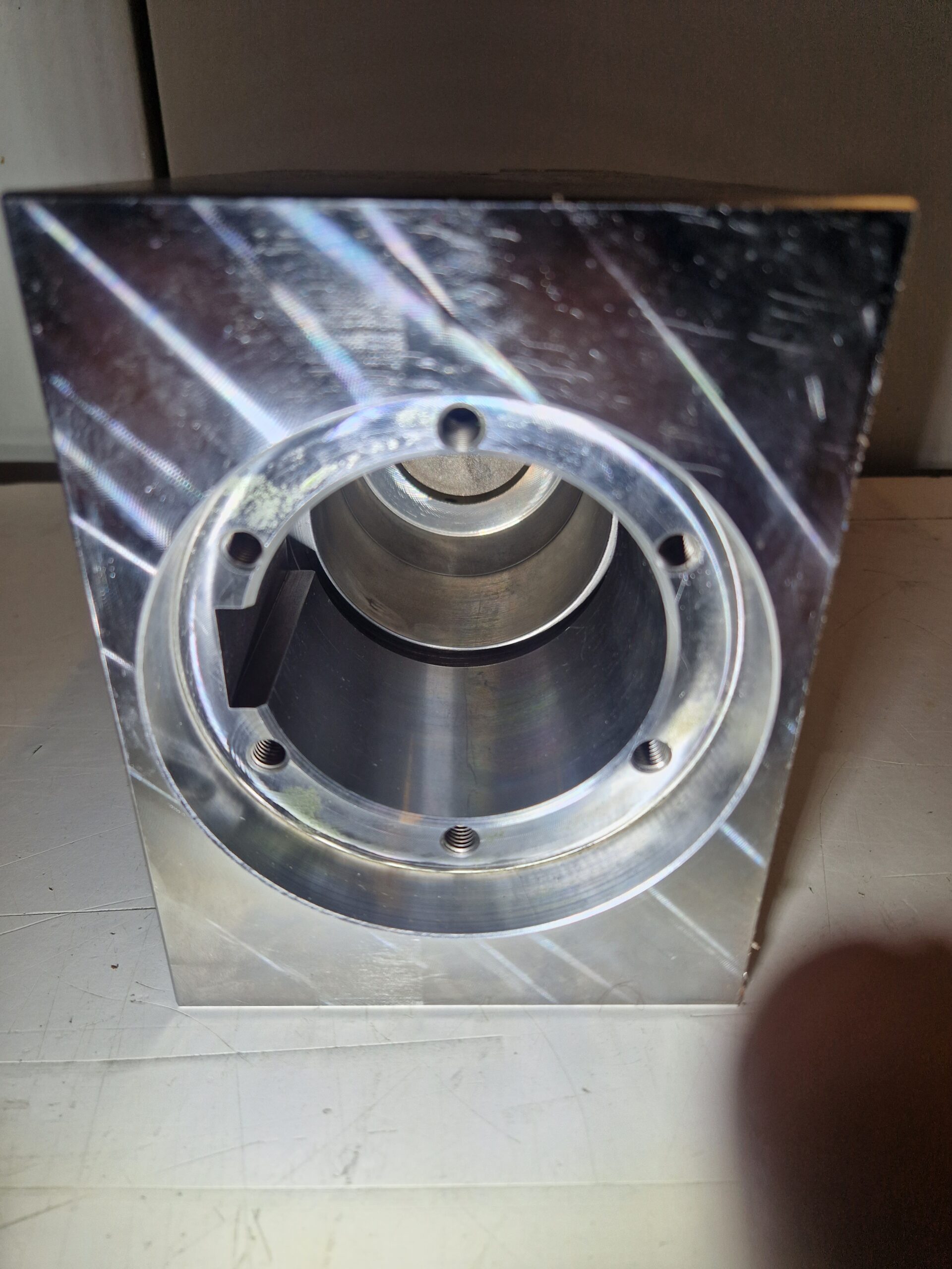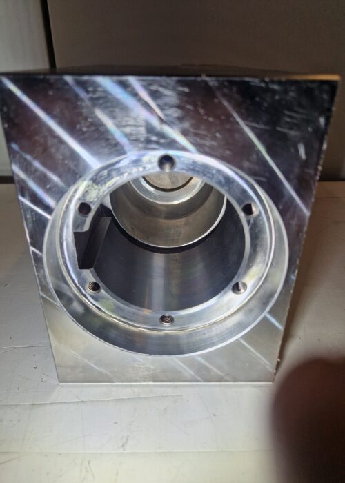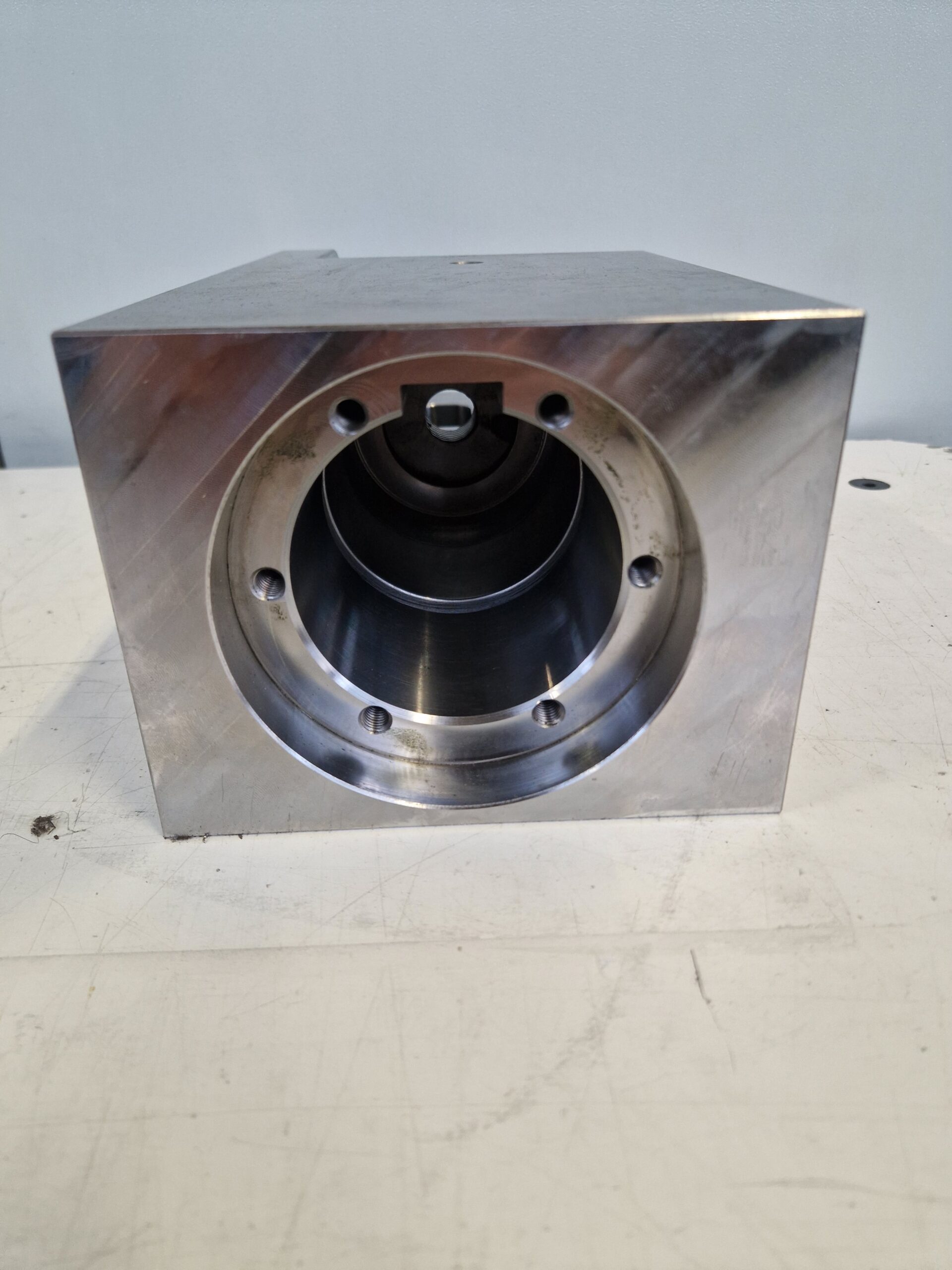 Il componente presenta rettifica dei piani con perpendicolarità e parallelismo centesimali, diametri tollerati centesimali e concentrici tra loro, forature e filettature orientate, sede chiavetta 22JS9 con tolleranza centesimale e orientata e smussi con diverse inclinazioni, garantendo precisione di accoppiamento e qualità costante.